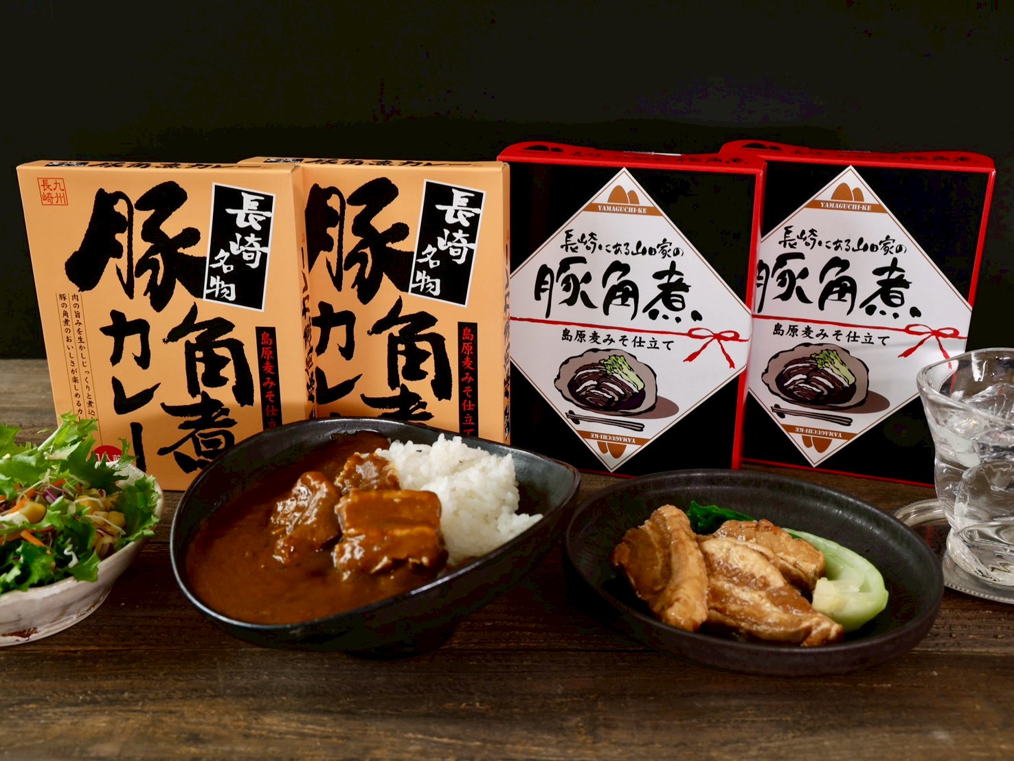 長崎名物「豚角煮」 を島原麦みそ仕立てで家庭の味に仕上ました。お湯で温めるだけで食べられるのでお手軽に長崎名物をお楽しみ頂けます。